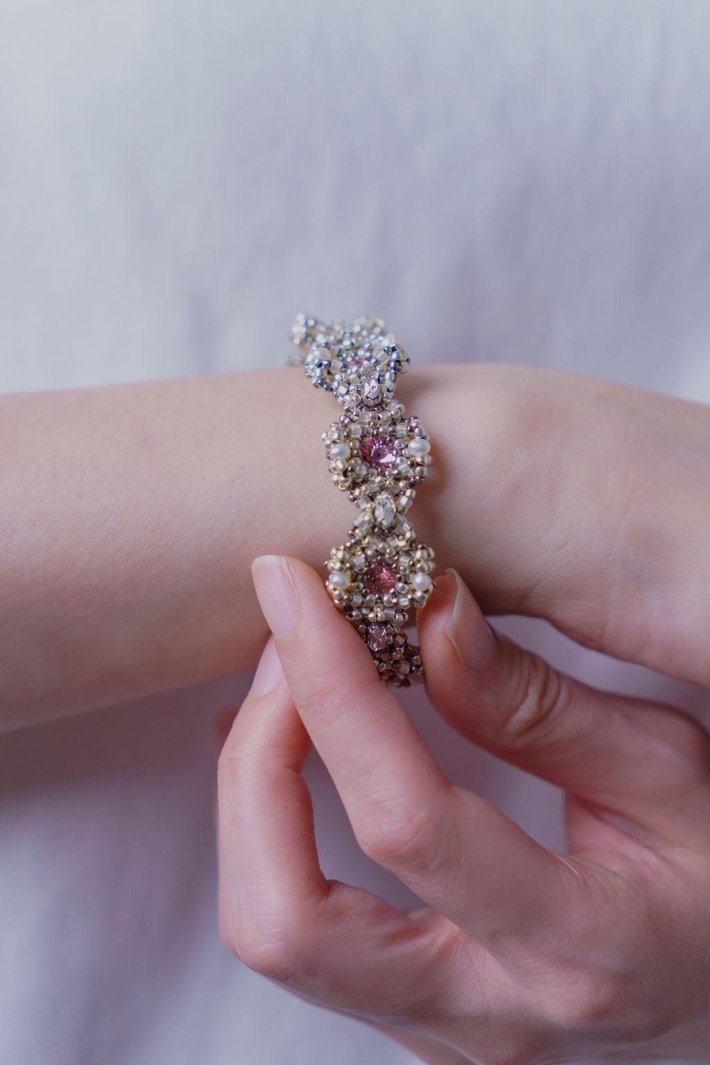 。兩面都能戴的手環,背面由銀白色編織珠製作,佩戴上呈現金屬感