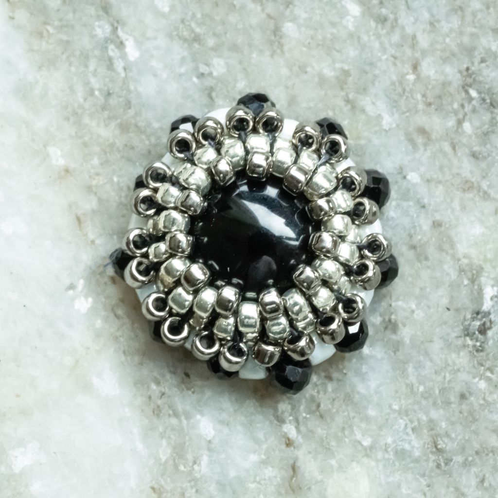 。中間圓形黑瑪瑙搭配周圍小顆切邊黑瑪瑙環繞,兩者的空間以銀色編織珠填滿