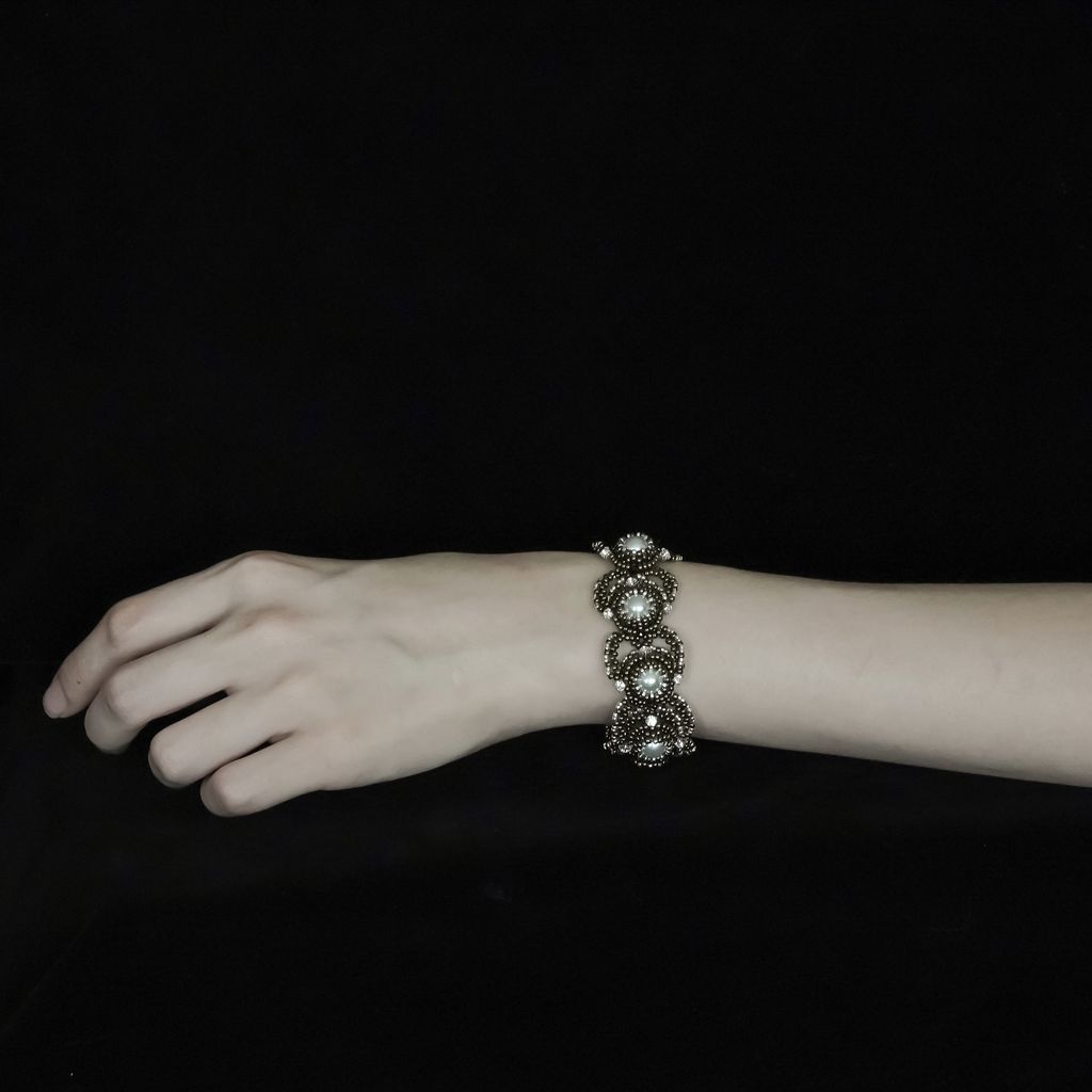 。古銅金色的編織珠搭配上圓潤的水晶珍珠,特有的古典感搭配上銀白色的水晶珍珠,白金色澤的搭配更顯典雅細緻