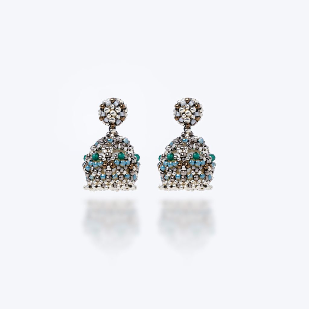 。充滿異國風情的吊鐘耳環,選用多面切割的綠寶及大家珍愛的珍珠,並混合著好幾種色澤的玻璃珠