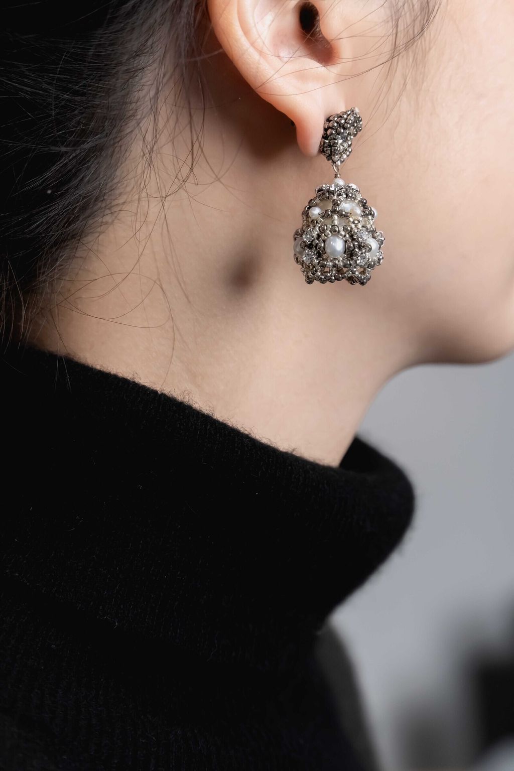 。特殊的磨砂質感藍綠色玻璃珠,給大洋蔥設計全新的色彩質地,層次更加鮮明,在珍珠與縷空的搭配下,霧霾的藍色是更多故事性的籠罩